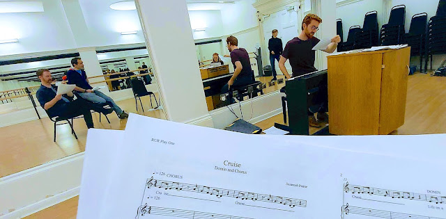 The Network Theatre is underneath Waterloo Station, down a tunnel, beyond the smells, and very pleasant. You can come tonight, Thursday or Friday. The special effect might be a zipwire. The night promises to be smart and silly (we're wearing shirts and doing voices) and the apocalypse-spanning songs, by Susannah Pearse, are typically astonishing – I love singing Sue's stuff at Christmas. The source material is Karel Čapek's play "Rossum's Universal Robots" – the source of the word "robot" and I think I'm playing the guy on the left. Olé!